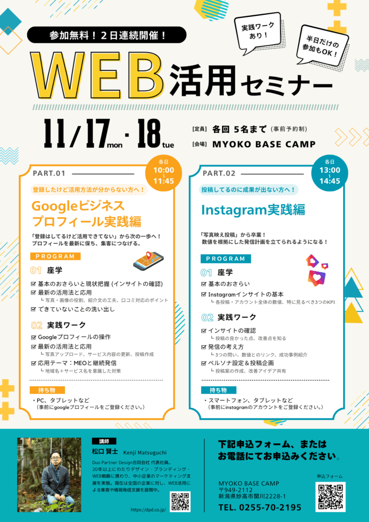 WEB活用セミナー(Googleビジネス/Instagram 実践編)に、弊社代表の 松口賢士(まつぐち・けんじ) が講師として登壇いたします。